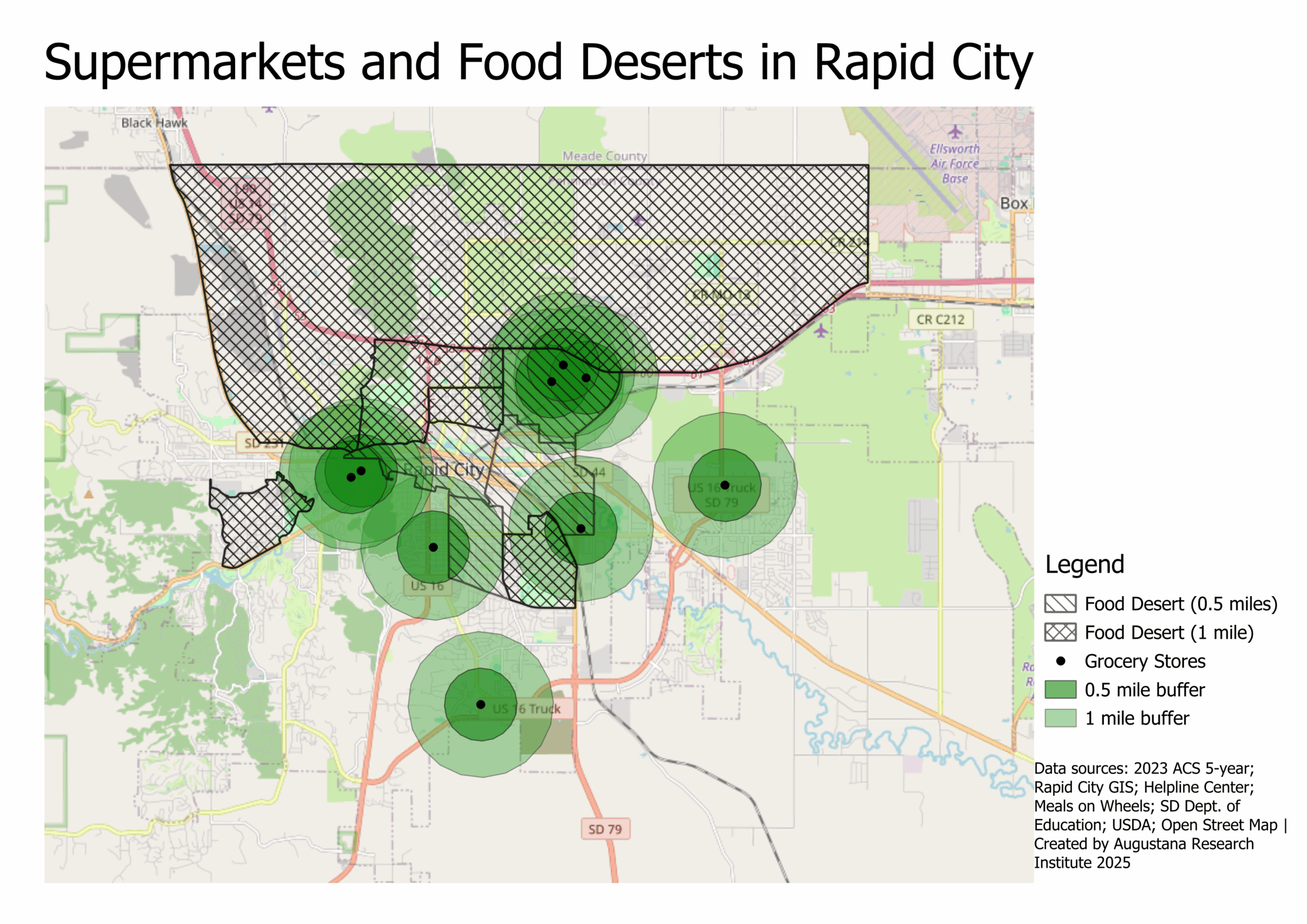 As a whole, food desert census tracts in Rapid City house a disproportionate number of Indigenous residents and residents in poverty compared to citywide averages.